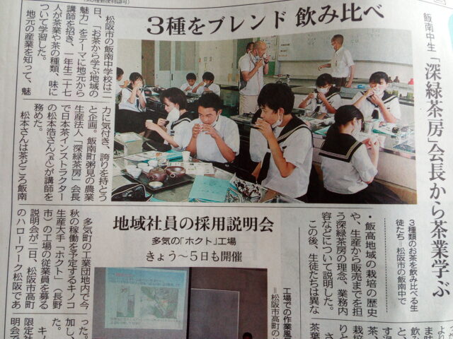 ホーム > 2021年度 / 学校活動の様子 あしやまタイム 今日は、1年生のあしやまタイムでした。 新緑茶房の方に来ていただき、松阪の産業であるお茶についていろいろ教えていただきました。 まずは教室で座学です。 調理室で、実際にお茶を入れて味わって学習です。 7月3日中日新聞朝刊の記事に掲載していただきました。 シェアする Twitter でシェア はてなブックマークに保存 LINE でシェア Facebook でシェア Pocket に保存 Feedly で購読 関連投稿 学校活動の様子 3年生 後期中間テスト 学校活動の様子 修学旅行(2日目) 学校活動の様子 子ども人権文化フェスタ事前学習会 2021年度 / 学校活動の様子 道徳 学校活動の様子 令和6年度 飯南中学校文化祭(ステージ発表) 学校活動の様子 雨の日の部活動 前の投稿 壮行会(松阪地区総合体育大会) 次の投稿 中体連地区大会(野球)