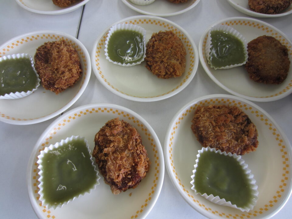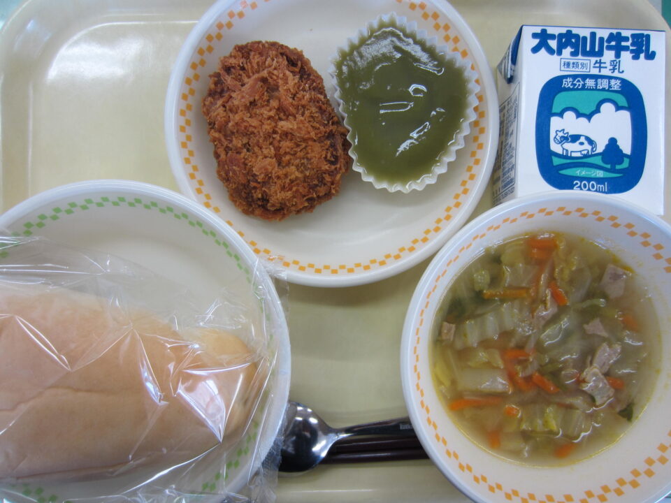 今日のメニューは、「さといもコロッケ」「クレソン入り野菜スープ」「飯南茶ういろ」「コッペパン」「牛乳」です。
