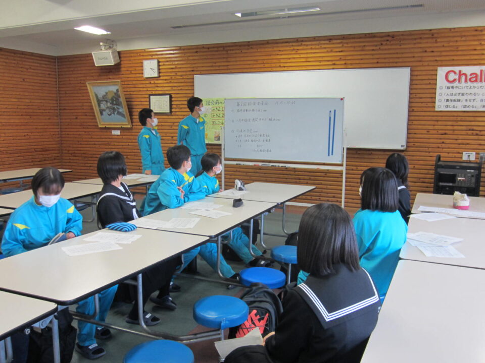 生徒会本部代議員・・・生徒会行事の企画、運営(スポーツフェスティバル、文化祭、離任される先生とのお別れ会、任命式・退任式)、選挙管理委員会、地域貢献活動の企画などが仕事です。