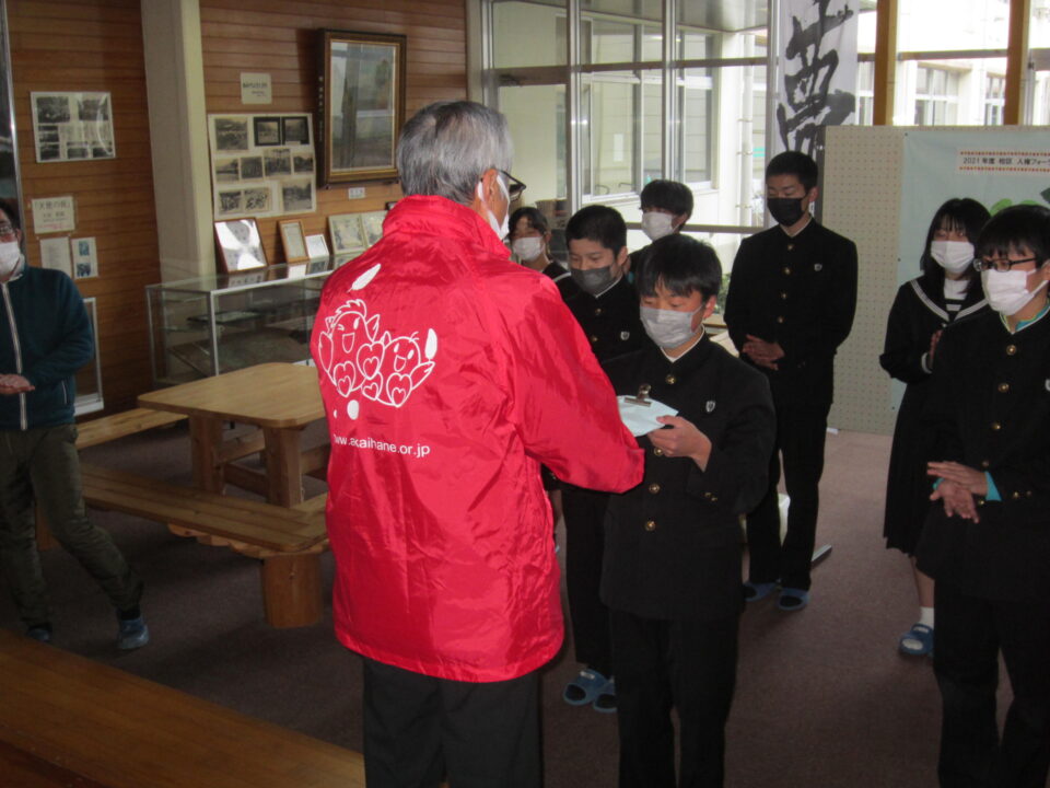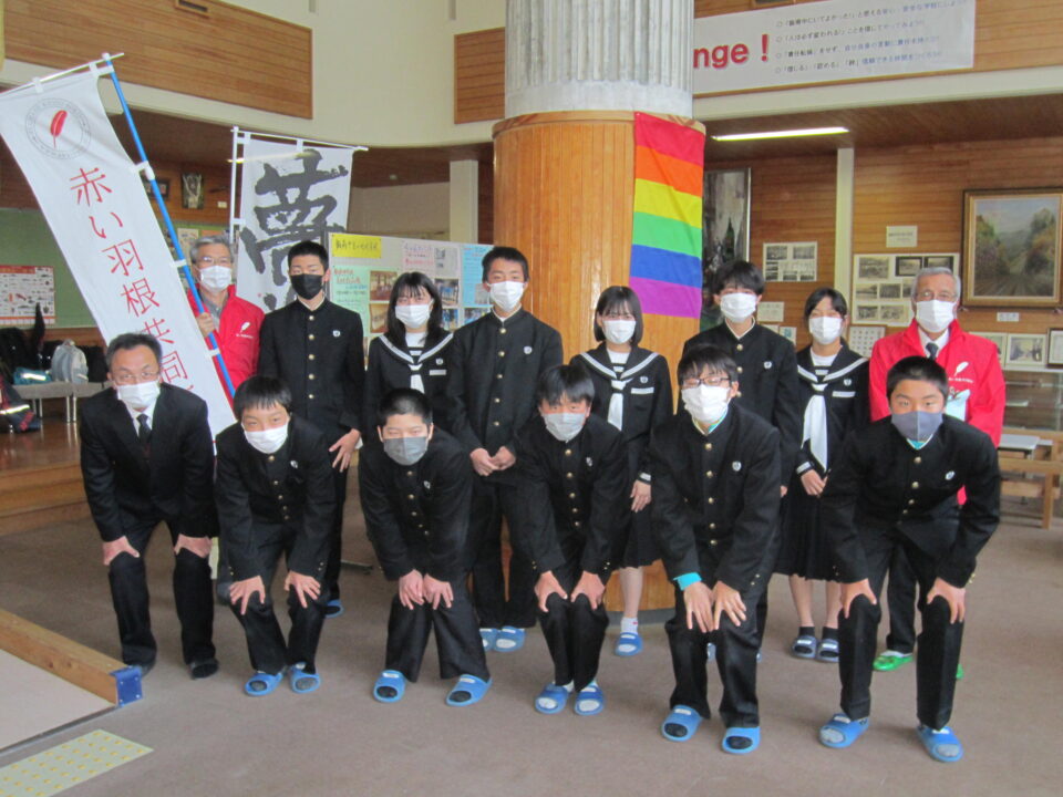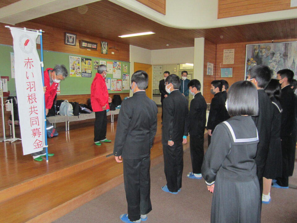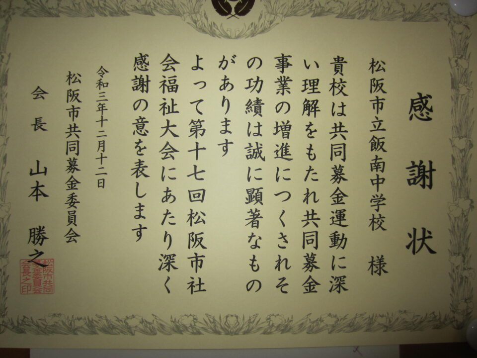 ホーム > 学校活動の様子 赤い羽根共同募金 生徒会役員さんが中心となって呼びかけをしてれた「赤い羽根の共同募金」の受け渡し式を行いました。 総額3.965円集まりました。募金は、私たちの住む町「松阪市」のために使われるそうです。 松阪市社会福祉協議会の皆さんと、記念撮影。 年末には、感謝状もいただきました。 シェアする Twitter でシェア はてなブックマークに保存 LINE でシェア Facebook でシェア Pocket に保存 Feedly で購読 関連投稿 2021年度 / 学校活動の様子 土曜授業 2021年度 / 学校活動の様子 朝読 学校活動の様子 創作部 交通安全のぼり旗完成 学校活動の様子 式歌練習 学校活動の様子 中高一貫生徒会代表会議を行いました! 学校活動の様子 1年生 社会見学 前の投稿 1年理科 2年修学旅行説明会 次の投稿 1年2年実力テスト 3年前期選抜