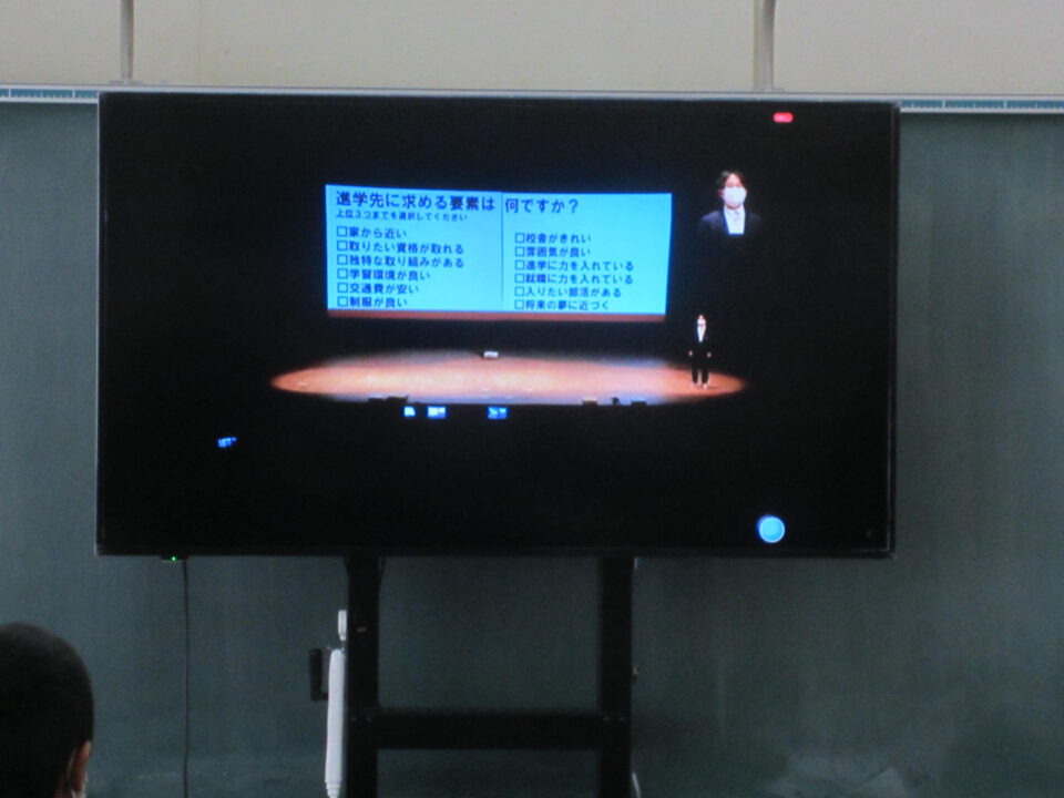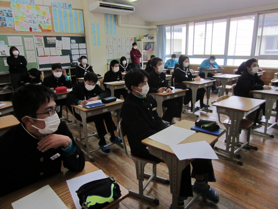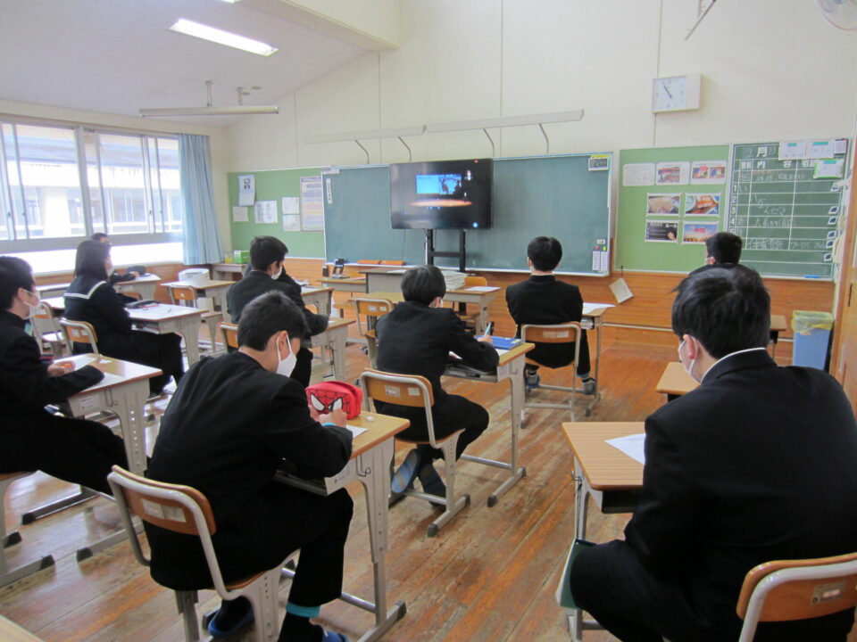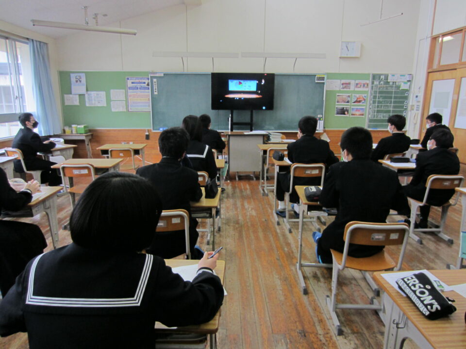 2年生は1から3限で、「いいなんゼミ」の授業を行いました。「いいなんゼミ」は、飯南高校の「総合的な学習の時間」の名称で、3年生全員が3単位履修しています。このゼミの中で、飯南高校での多様な教科・科目の選択履修によって深められた興味・関心・意欲、進路希望等に基づいて4月から自分で課題(テーマ)を設定し、その課題の解決を図るべく研究を進めています。「いいなんゼミ」は、その成果を全校生徒や保護者、地域の方々、連携中学校の生徒、教育関係者対象に発表するものです。例年ですと飯南町産業文化センターに出向いて参加をしていますが、今年度もZOOM配信で、教室での視聴になりました。