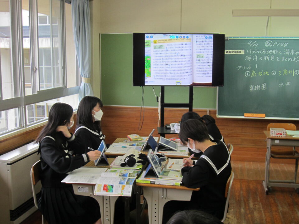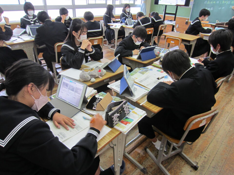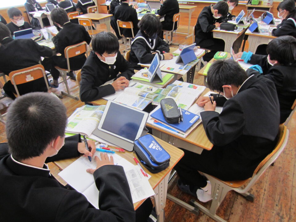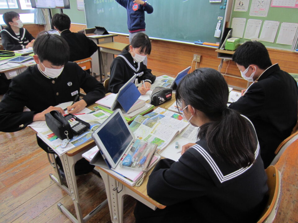 ホーム > 2022年度 / 学校活動の様子 1年数学 2年社会 3年英語 1年生数学 最初の単元は「正の数・負の数」です。中学校の数学の基本単元になります。使い方、計算の仕方をしっかり学びましょう。 3年生の英語です。 受動態の使い方の学習でした。理解できましたか。 2年の社会です。 川が作る地形と、海岸や海洋と特色の学習です。 タブレットを利用してのグループ学習でした。 シェアする Twitter でシェア はてなブックマークに保存 LINE でシェア Facebook でシェア Pocket に保存 Feedly で購読 関連投稿 学校活動の様子 分散授業(最終日) 学校活動の様子 いいタイム ~いいなん・いい関係・いい雰囲気・いい時間~ 学校活動の様子 和食の日 学校活動の様子 よむYOMUワークシート(読解力向上プロジェクト事業) 学校活動の様子 3年生 後期中間テスト 学校活動の様子 授業のようす 前の投稿 1年英語 2年体育 3年数学 次の投稿 3年体育〜体力テスト実施中