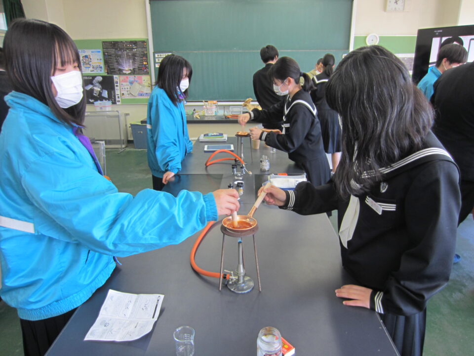 ホーム > 2021年度 / 学校活動の様子 1年社会 3年理科 1年生の社会科です。今日のテーマは、東アジアとの交流「明や朝鮮との交流は、日本にどのような影響を与えたか」です。 本題に入る前に、この数日社会問題になっている「ウクライナの情勢」について、学習がありました。 3年生の授業は、いよいよあとわずかになりました。 今日の理科は、2年生の時に出来なかった、化学反応の実験です。 カルメ焼きを作って、どのように反応が起こるかを確かめました。 シェアする Twitter でシェア はてなブックマークに保存 LINE でシェア Facebook でシェア Pocket に保存 Feedly で購読 関連投稿 学校活動の様子 授業の様子 特別の教育課程「人間と社会」 / 学校活動の様子 1年生 「職業調べ」発表会をしました。 2022年度 / 学校活動の様子 1年音楽 2年英語 3年社会 学校活動の様子 中高一貫生徒交流会【1・2年生】 学校活動の様子 文化祭② 2022年度 / 学校活動の様子 和食の日 前の投稿 1年生 パンジーの植え付け 次の投稿 卒業式練習
