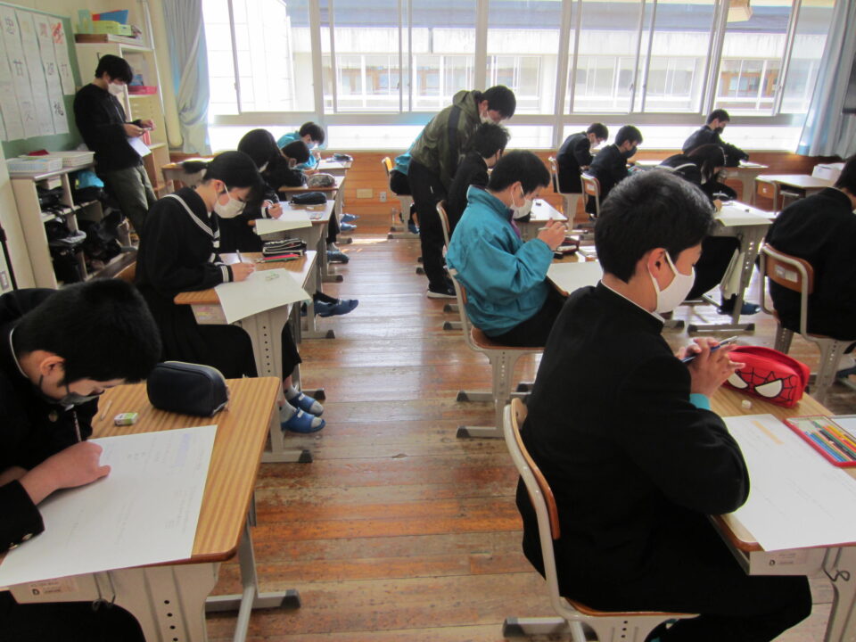 ホーム > 学校活動の様子 2年生 心のストレッチ 本校に来ていただいているカウンセラーの先生に、 「自分をみつめなおそう(心のストレッチ)」というテーマで、授業をしていただきました。 (1月28日に2年生でも授業をしてもらっています) ワークシートで、①心の元気度 ②自分を探しながら色々な見方をしてみよう に取り組み、自分を見つめなおす機会を作りました。 子どもたちの感想は、お家でお聞きください。 シェアする Twitter でシェア はてなブックマークに保存 LINE でシェア Facebook でシェア Pocket に保存 Feedly で購読 関連投稿 学校活動の様子 大江中学校 合同授業 学校活動の様子 1年生 授業の様子(家庭科) 学校活動の様子 全国学校給食週間4日目 2022年度 / 学校活動の様子 生徒会専門委員会 学校活動の様子 3年修学旅行5(ホテル到着) 学校活動の様子 金曜日の朝は「よむYOMUワークシート」(読解力向上プロジェクト事業) 前の投稿 今日の給食 次の投稿 学年末テスト1日目