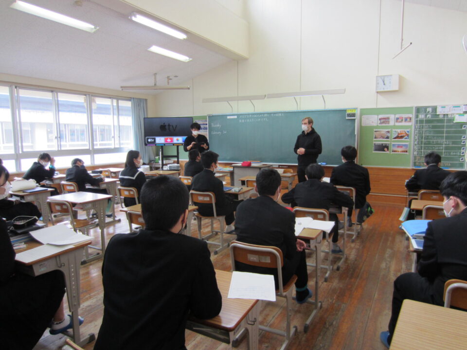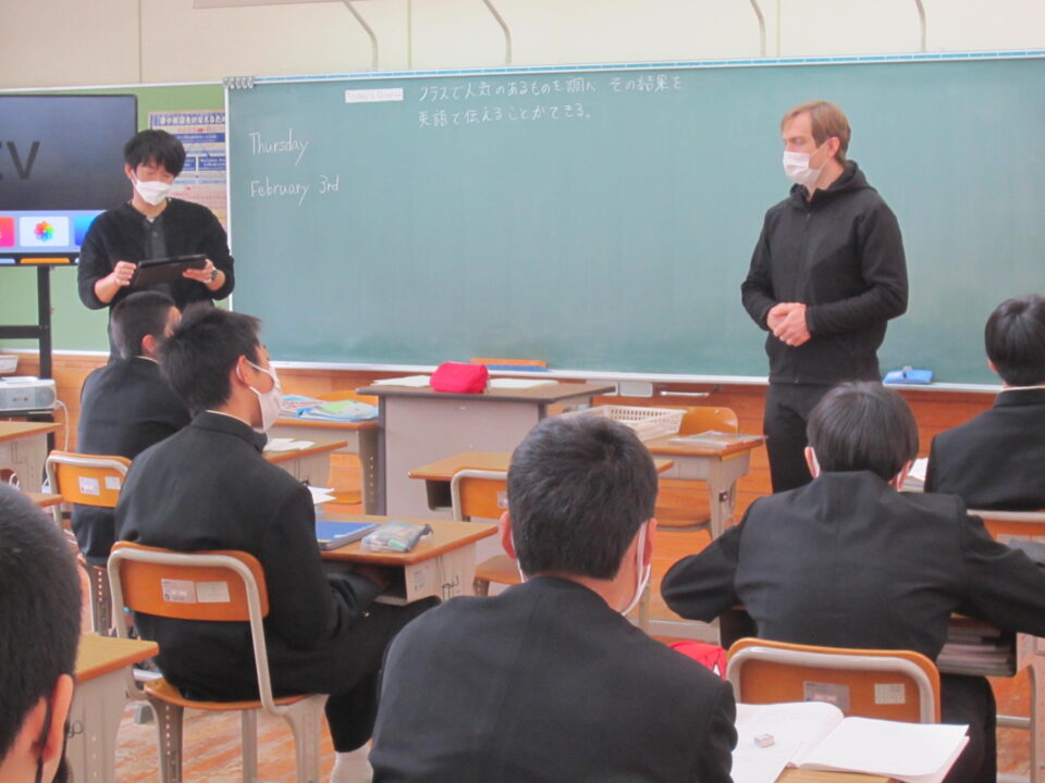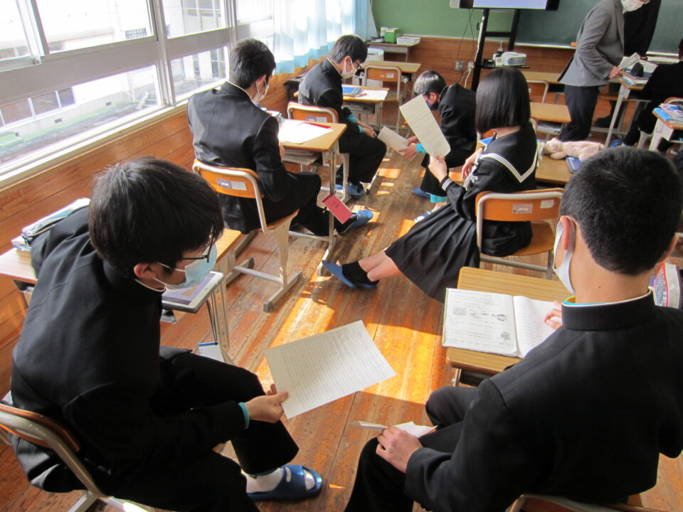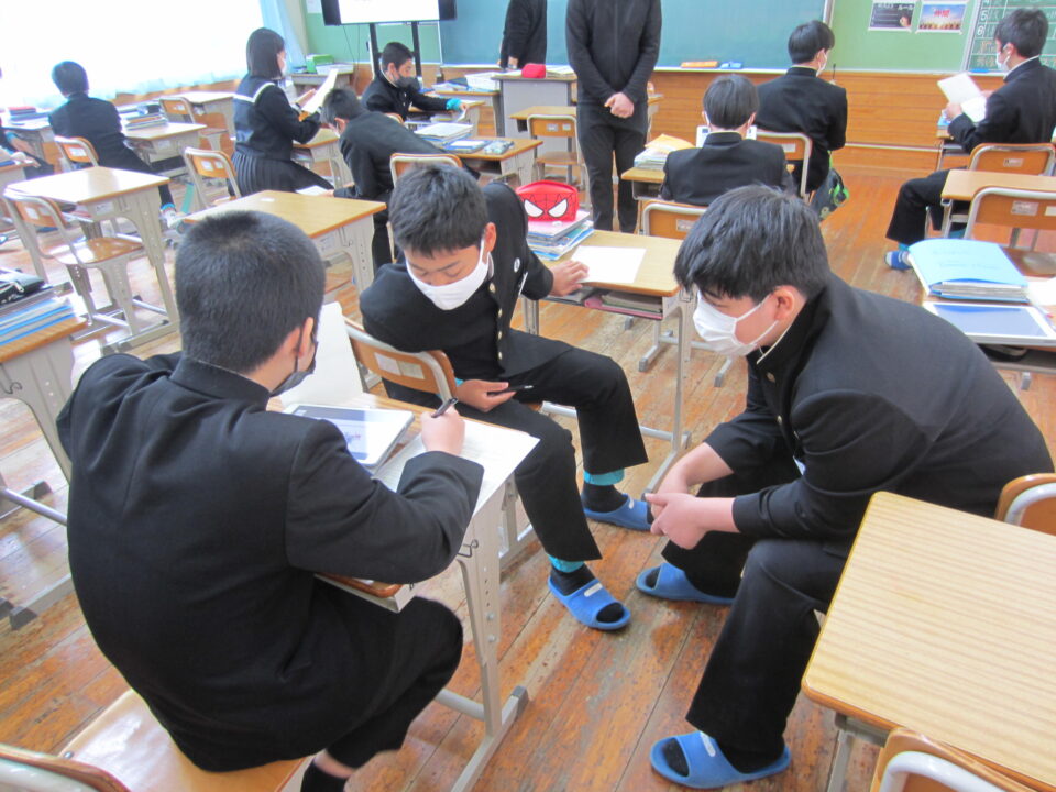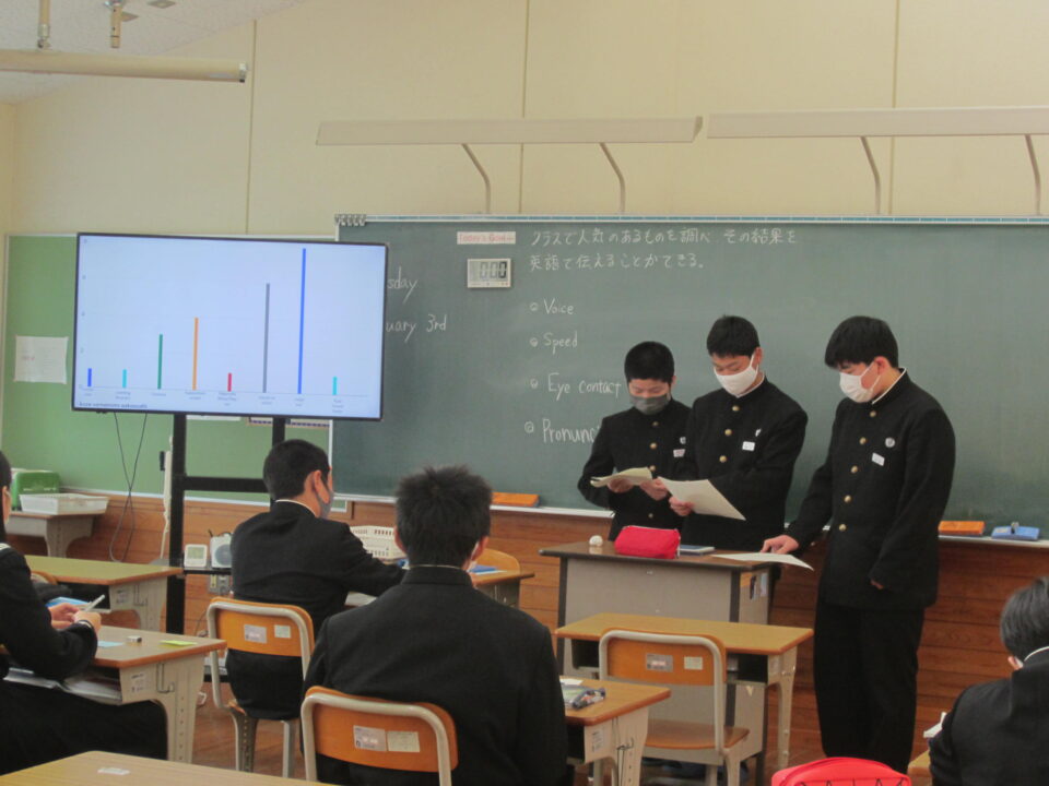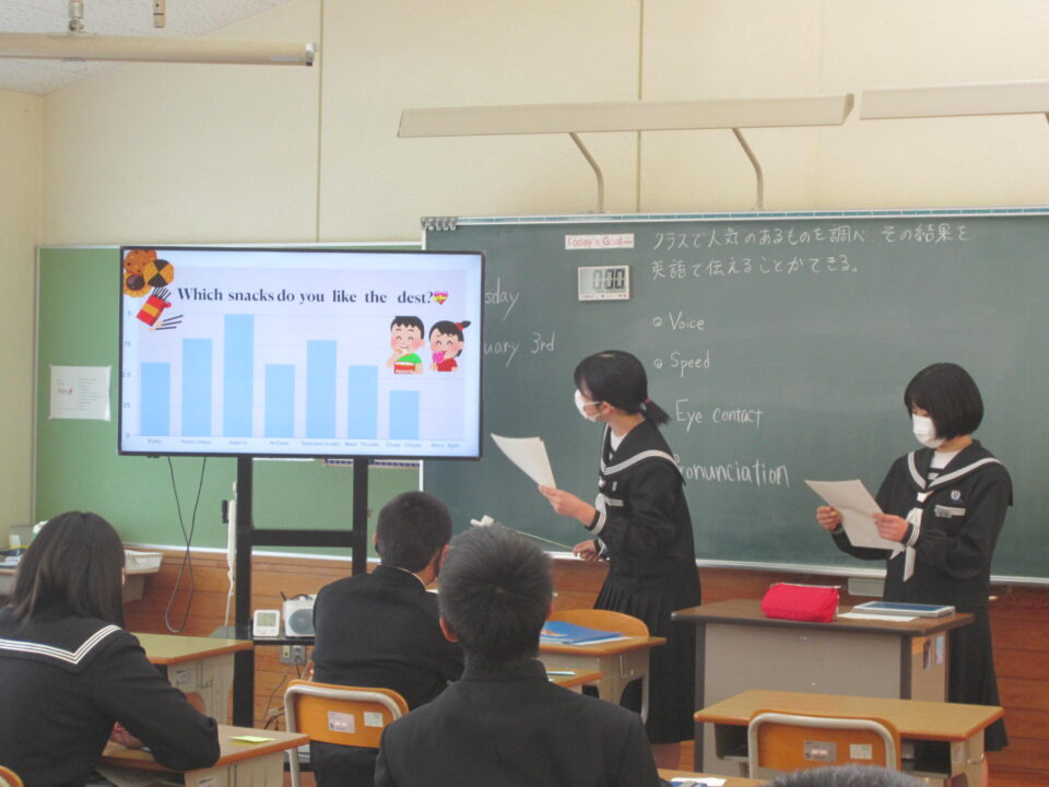 ホーム > 学校活動の様子 2年英語 2年生の英語です。比較表現を用いた文の学習です。クラスで人気のあるものを調べ、タブレットで資料を作成し、 みんなの前でスピーチをします。 今日は、ALTの先生にも指導してもらいました。 グループで発表の打ち合わせをしています。 モニターに写された資料を見ながら発表です。 シェアする Twitter でシェア はてなブックマークに保存 LINE でシェア Facebook でシェア Pocket に保存 Feedly で購読 関連投稿 学校活動の様子 3年生中間テスト3日目 学校活動の様子 すくすくタイム 学校活動の様子 あいさつ運動 学校活動の様子 第37回全国都道府県対抗中学バレーボール大会三重県選抜女子チームで出場! 2025年度 / コミュニティ・スクール / 学校活動の様子 CSあいさつ運動 学校活動の様子 2年生修学旅行 出発 前の投稿 和食の日 次の投稿 1年理科