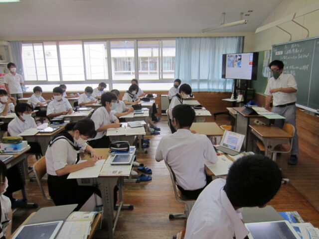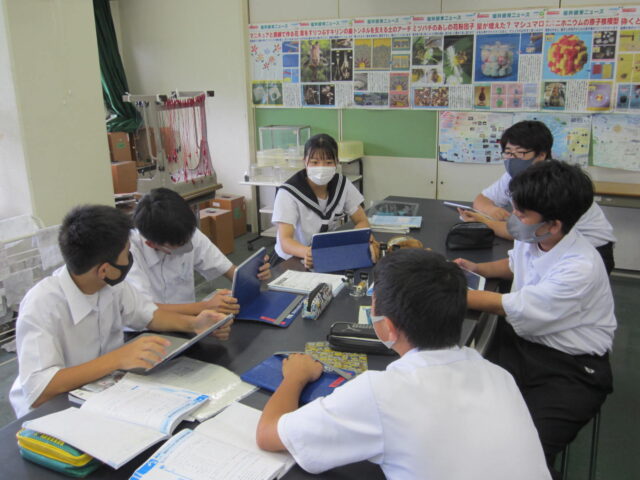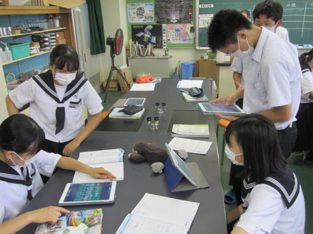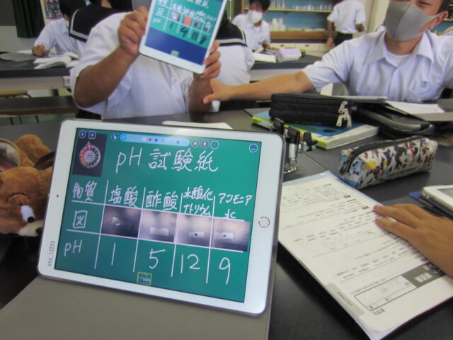 3年生は理科。酸性やアルカリ性の水溶液の性質の学習です。実験結果をタブレットを使ってまとめました。