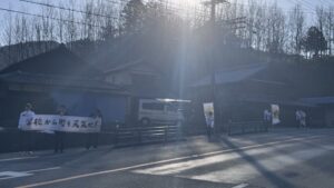 旗を持ち、通過する人に大きな声を出しながら頭を下げて挨拶をしました。