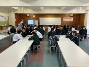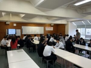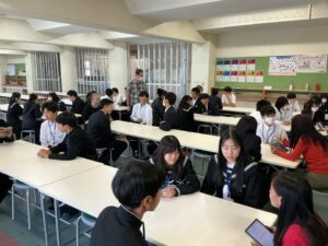 11名のALTが来校し、ランチルームで英語の授業を行いました。3人1組になりALTのスピーチを聞いた後、わからないことを質問したり、ALTの質問に答えたりしました。学習した表現を使ってコミュニケーションをとろうとよく頑張っていました。今回は3年生だけでしたが、秋頃には全学年でEnglish Dayを行う予定です。