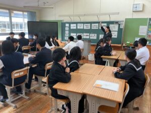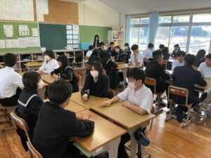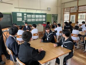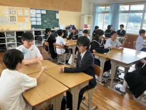 4人グループで数字のジャンケンを行い、黒板に掲示した足した数字のお題でトークを行う「アドジャン」の様子です。